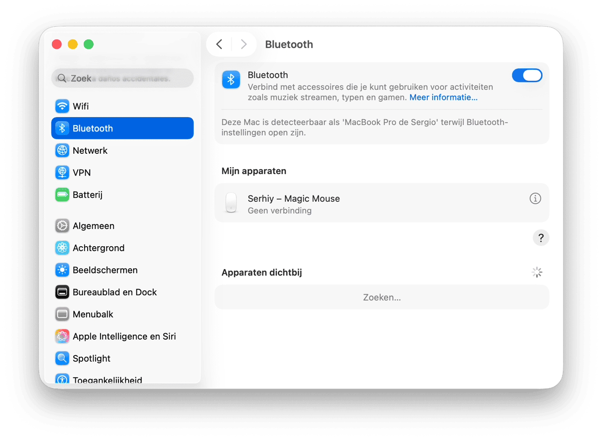Als je een draadloze muis of trackpad gebruikt, check je of deze verbonden is. Voor Bluetooth-apparaten ga je naar Systeeminstellingen > Bluetooth en maak je indien nodig opnieuw verbinding.