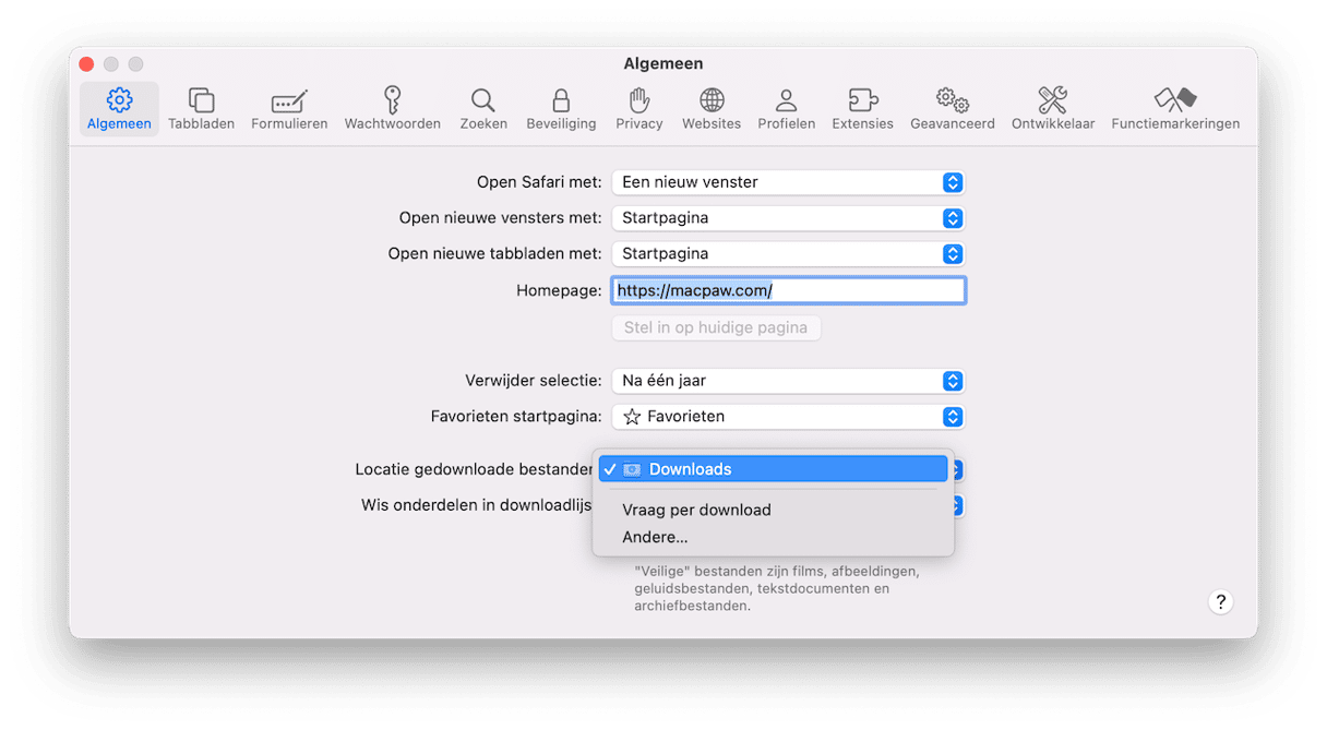 - Safari: Instellingen > Algemeen (naast 'Locatie gedownloade bestanden')