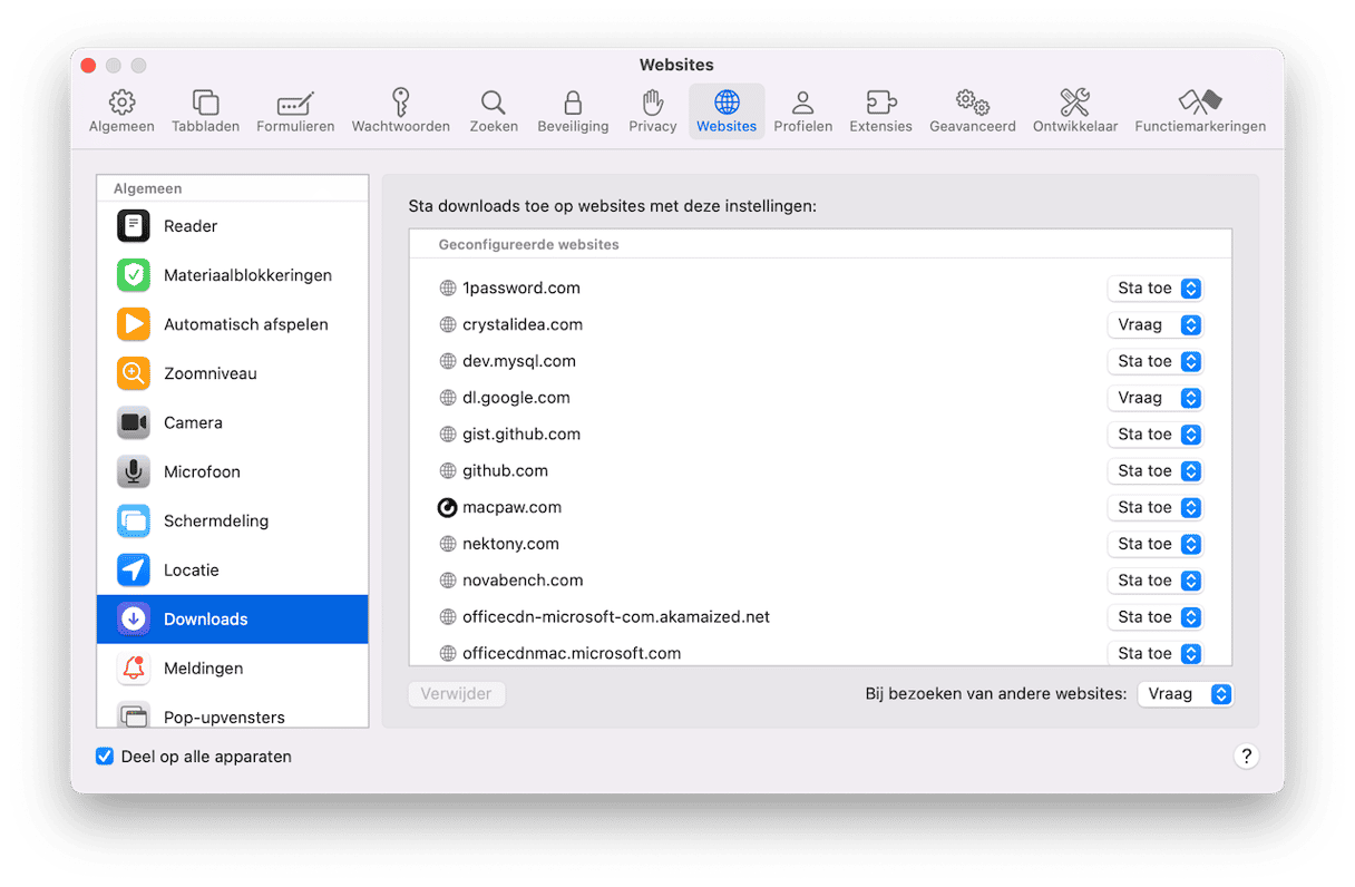 - Safari: ga naar Instellingen > Websites > Downloads en kijk welke websites deze bevoegdheid hebben