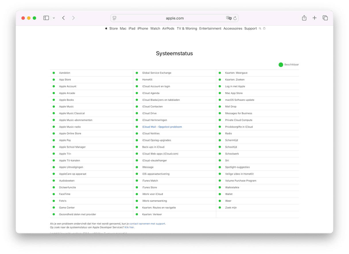 Als het bestand dat je probeert te downloaden afkomstig is uit de App Store of een andere Apple-dienst, of als het afkomstig is van je iCloud, kan het ook zijn dat de Apple-servers de oorzaak van het probleem zijn. Dat kun je via deze link in een webbrowser controleren. Zoek naar de dienst waarvan je probeert te downloaden, zoals de Mac App Store of iCloud Drive. Als deze als groen is gemarkeerd, dan werkt alles gewoon naar behoren. Zo niet, dan is er inderdaad iets aan de hand. In zo'n geval kun je alleen maar wachten tot dit wordt opgelost.