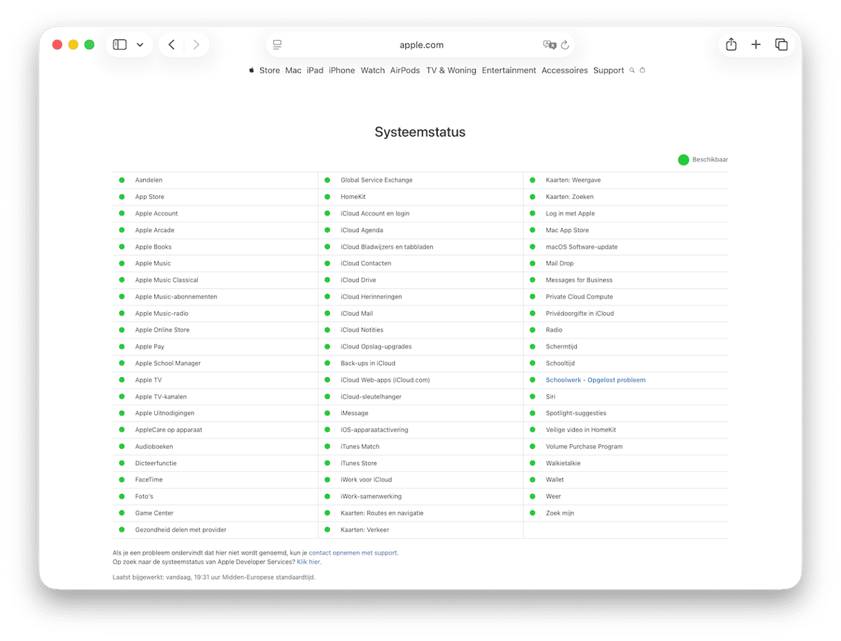 - Controleer of de Apple-servers naar behoren werken. Ga naar de statuspagina van Apple en zoek hier naar een groene stip naast 'macOS Software-update'.