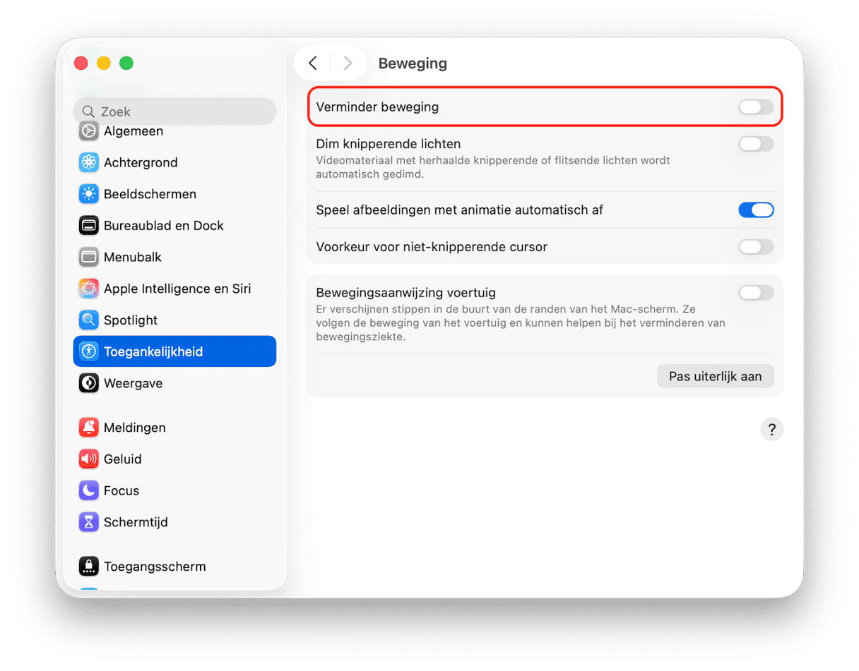 macOS Tahoe gebruikt meer stroom voor visuele effecten, waardoor animaties mogelijk niet vloeiend zijn op je Mac. Gelukkig kun je deze effecten ook uitschakelen: