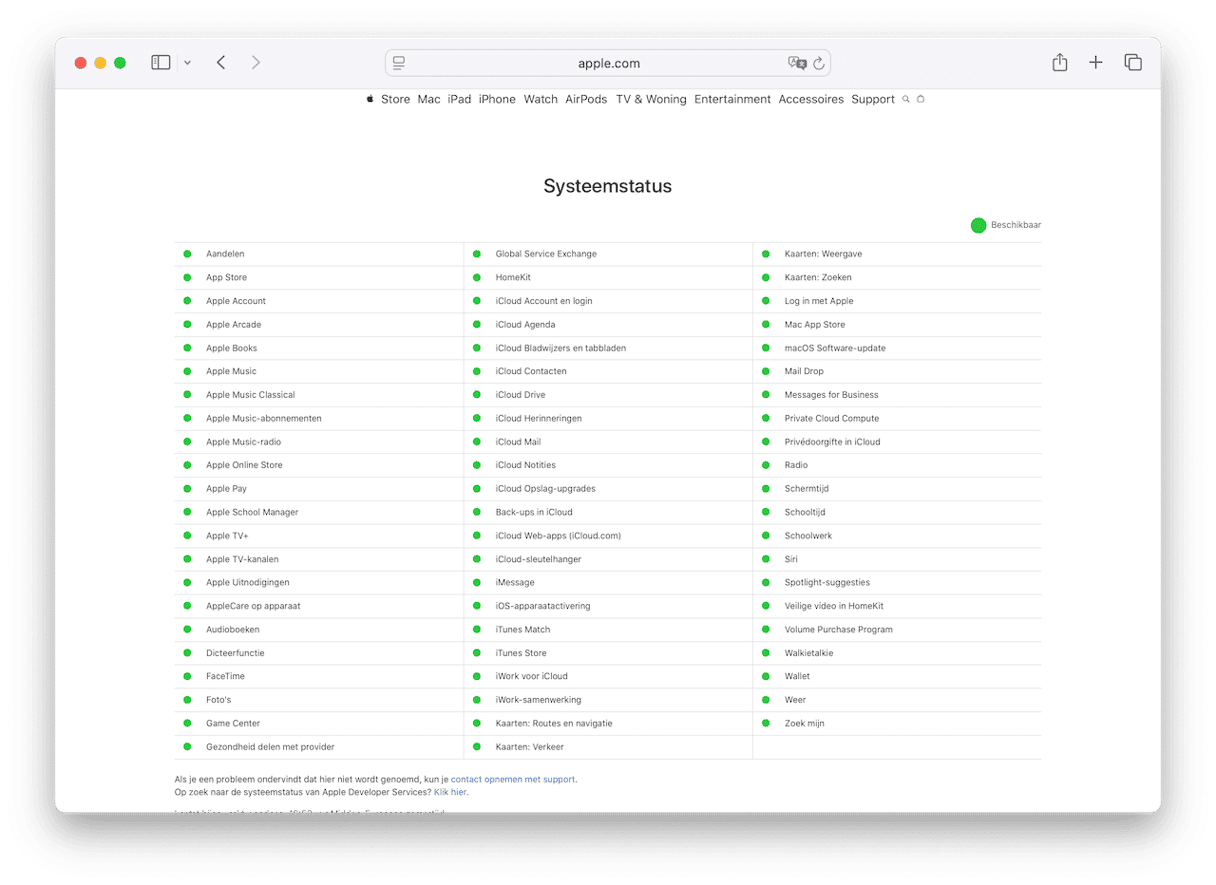 Apple heeft een statuspagina waarop je alle online services kunt zien en waar je meteen ziet of die online zijn via de groene en rode bolletjes. Je vindt de pagina hier.