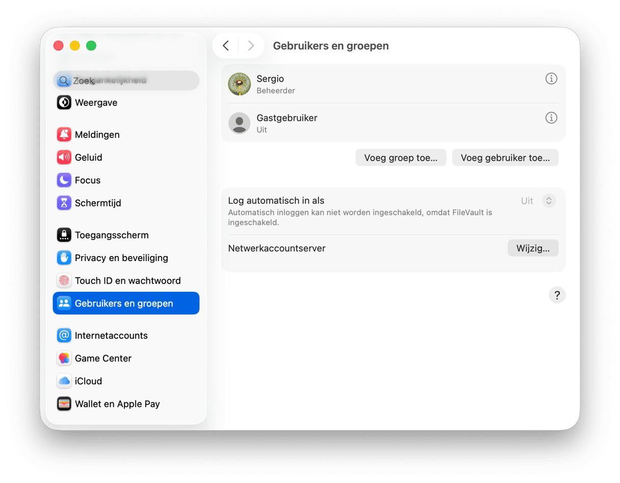 - Controleer geïnstalleerde profielen onder Systeeminstellingen > Gebruikers en groepen. Klik op de i naast de momenteel ingelogde gebruiker en zorg ervoor dat de functie 'Sta toe dat deze gebruiker deze computer beheert' is ingeschakeld. Het kan zijn dat je een account moet toevoegen als de huidige gebruiker geen beheerdersbevoegdheden heeft.