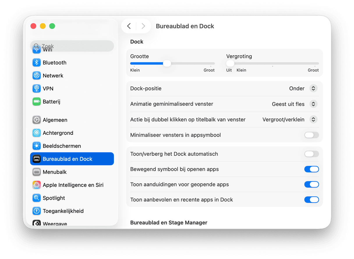 Hier zul je echter zien dat er geen optie is om het Dock op alle schermen weer te geven. Je kunt kiezen waar je het Dock wilt hebben, 'Verberg' en 'Toon' activeren, en kiezen of en hoe het Dock geanimeerd moet worden wanneer er apps worden geopend of vensters geminimaliseerd. Maar helaas vinden we hier niets over het weergeven van het Dock op al je schermen.