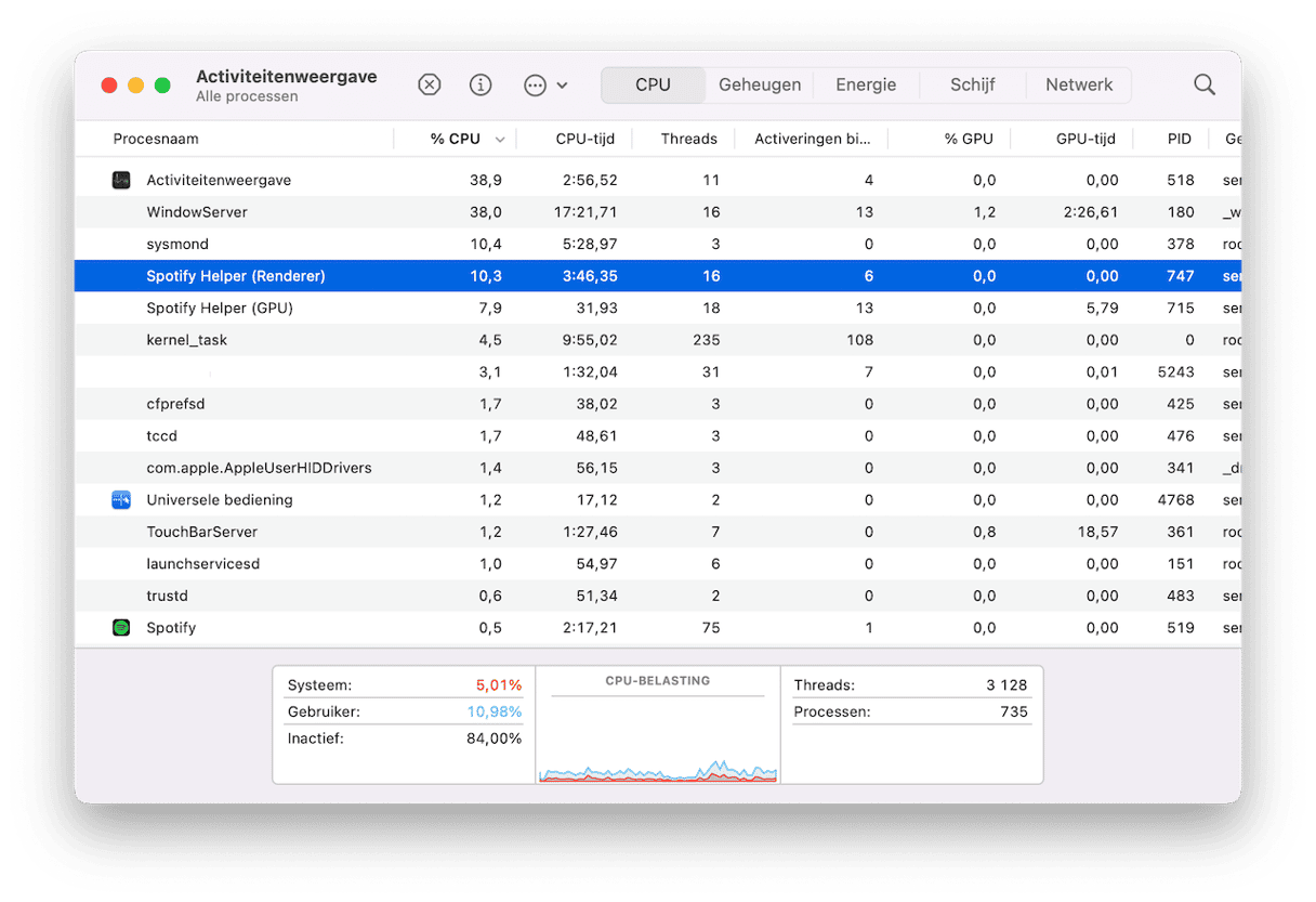 In de tabel onderaan zie je de systeembelasting als een percentage. Als die waarde veel hoger is dan 50% en daar lang blijft staan, in het bijzonder zonder een specifieke reden zoals games of apps met een hoge grafische belasting, is dat wellicht het teken dat je processor het probleem veroorzaakt.