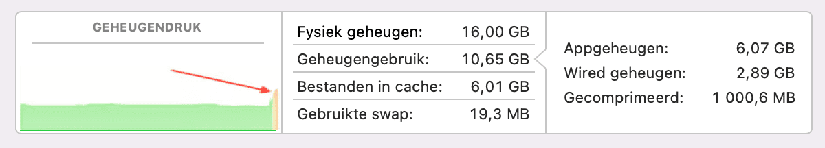Let goed op wanneer de grafiek Geheugendruk rood begint te worden.