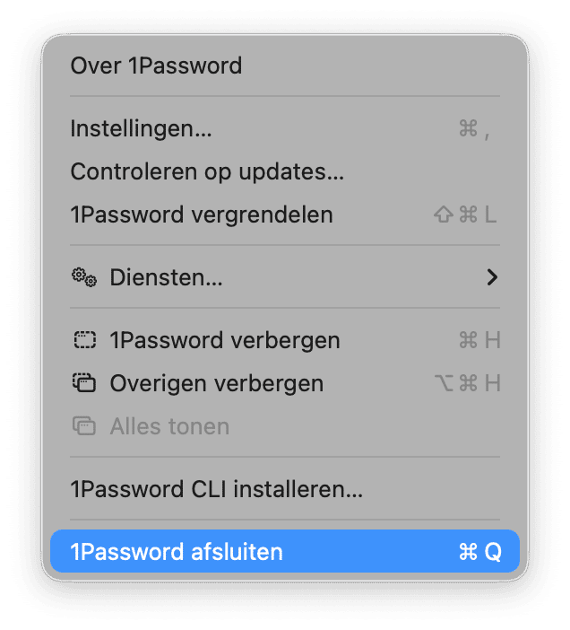 - Sluit 1Password eerst af als de app nog actief is. Klik op het 1Password-symbool in de menubalk en druk op 'Sluit'.