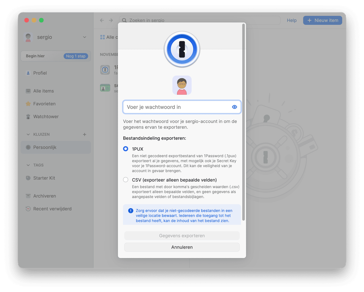 Voor je 1Password van je Mac verwijdert, is het belangrijk om gegevens die je later mogelijk nog nodig hebt te exporteren. Je kunt hierbij uit twee verschillende bestandsstructuren kiezen. De eerste is 1PUX, wat een eigen 1Password-bestandsstrctuur is die alleen kan worden geopend in 1Password. De andere is CSV, dat in tal van apps kan worden geopend, waaronder spreadsheet- en databasetools. Let wel dat je met deze structuur geen aangepaste velden of bestandsbijlagen exporteert.