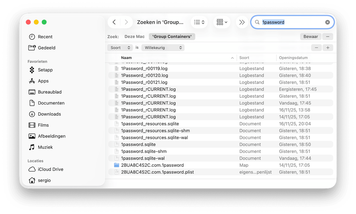 - Sleep in die map alle bestanden of mappen met '1Password' in de naam naar de Prullenmand. Door de zoekfunctie te gebruiken kun je ze sneller vinden.