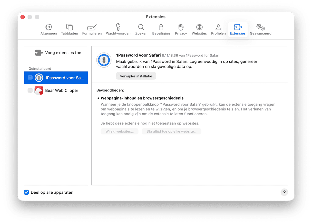 Als je de browserextensie van 1Password gebruikt, moet je die ook verwijderen. Dat gaat als volgt in Safari:
