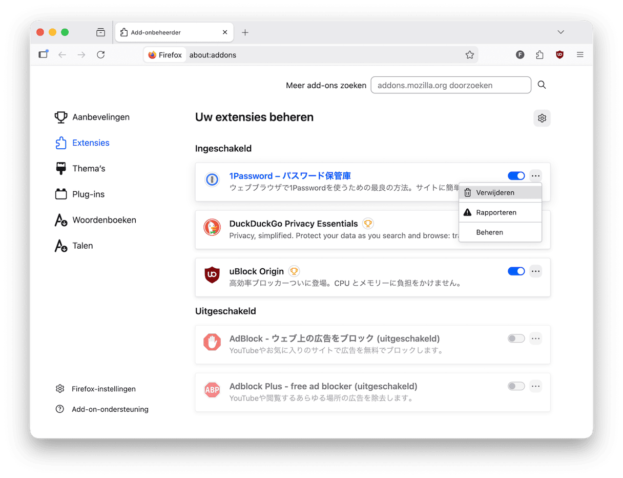 - Zoek hier naar 1Password en als je de extensie vindt, klik je op 'Verwijderen'.
