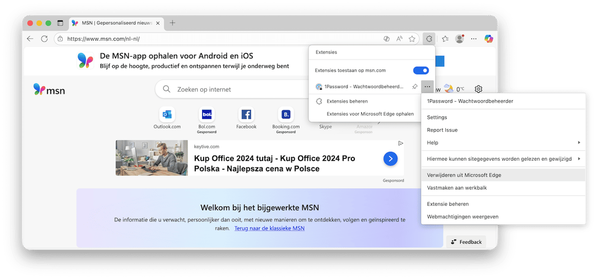 - Klik op de drie puntjes naast 1Password en kies 'Verwijderen uit Microsoft Edge'.