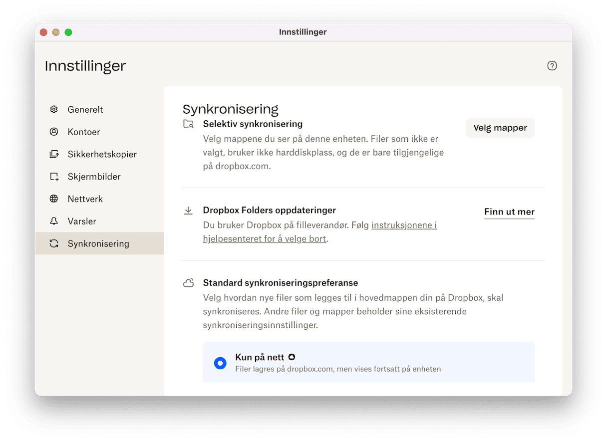 Smart synkronisering lar deg se alle filene i Dropbox uten å ta opp plass på Mac-en, fordi den kun lar deg lagre filene dine på nettet.