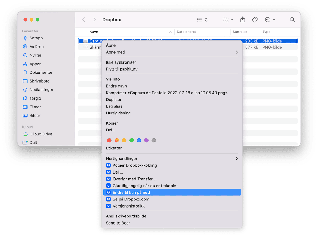 På Mac, når du installerer Dropbox-programmet og kobler det til kontoen din, synkroniseres alle filer du plasserer i Dropbox-mappen i Finder med Dropbox sine servere og er tilgjengelig på andre enheter du er logget på kontoen din på.