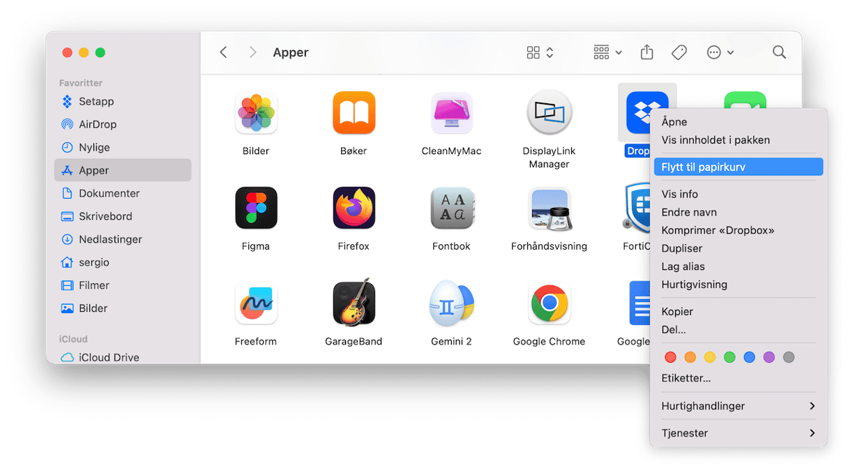 - Gå til Programmer-mappen og send Dropbox-appen til papirkurven.