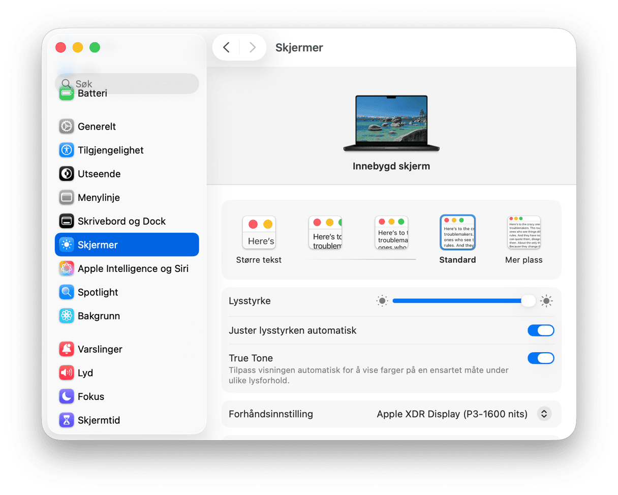 De skarpeste lyspærene bruker mer energi; det samme gjelder for skjermens belysning. Se på Skjerminnstillinger i systeminnstillingene, og gjør et par justeringer der. Sørg for å deaktivere alternativet «Juster lysstyrken automatisk»