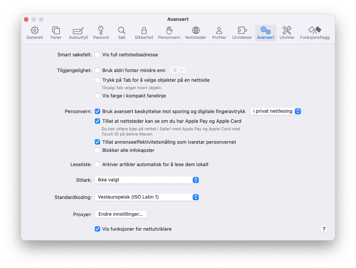 - I fanen Avansert merker du av for Vis utviklermeny i menylinjen (Vis funksjoner for utviklere i macOS Sonoma).