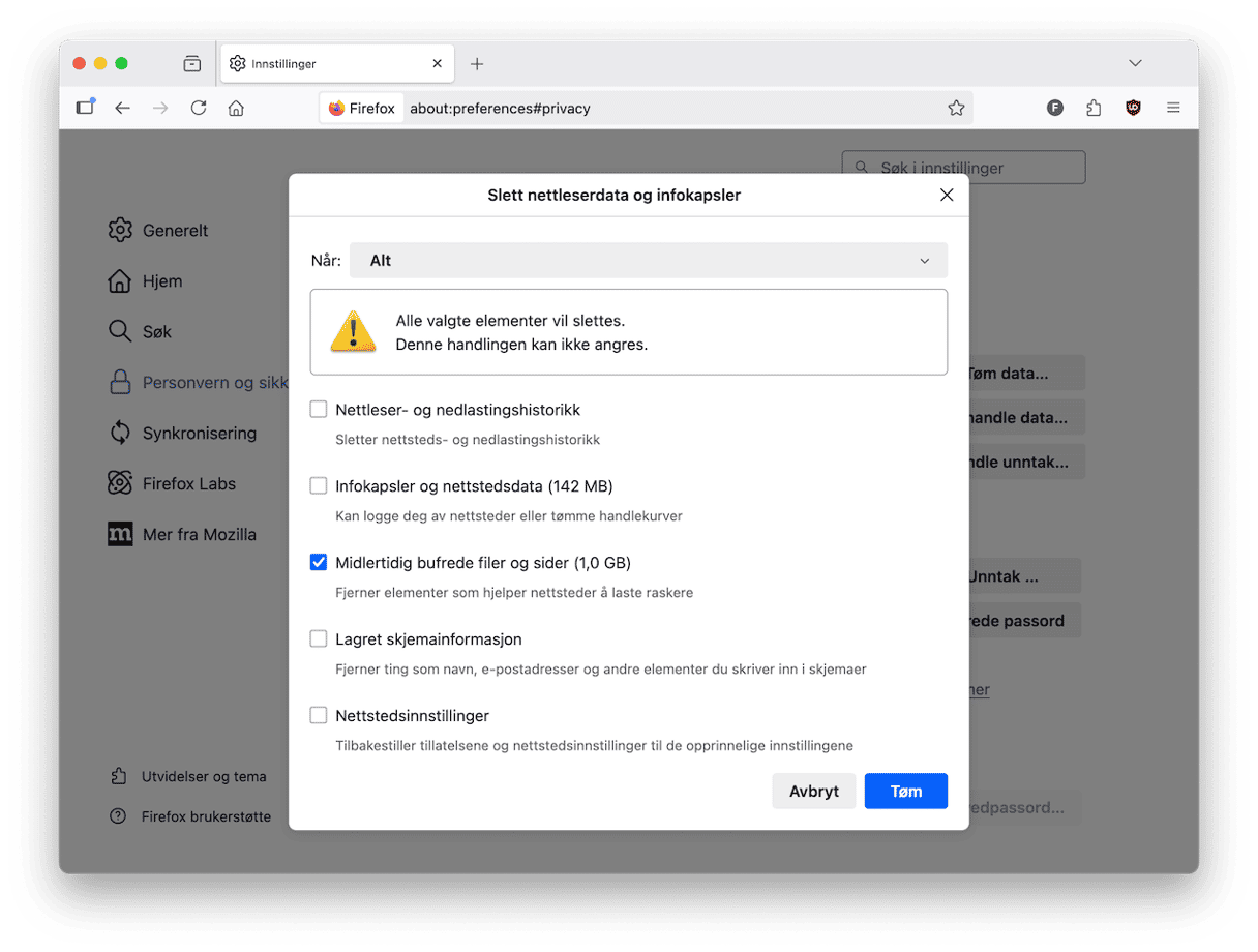 - Merk midlertidige bufrede filer og sider og klikk på Tøm.