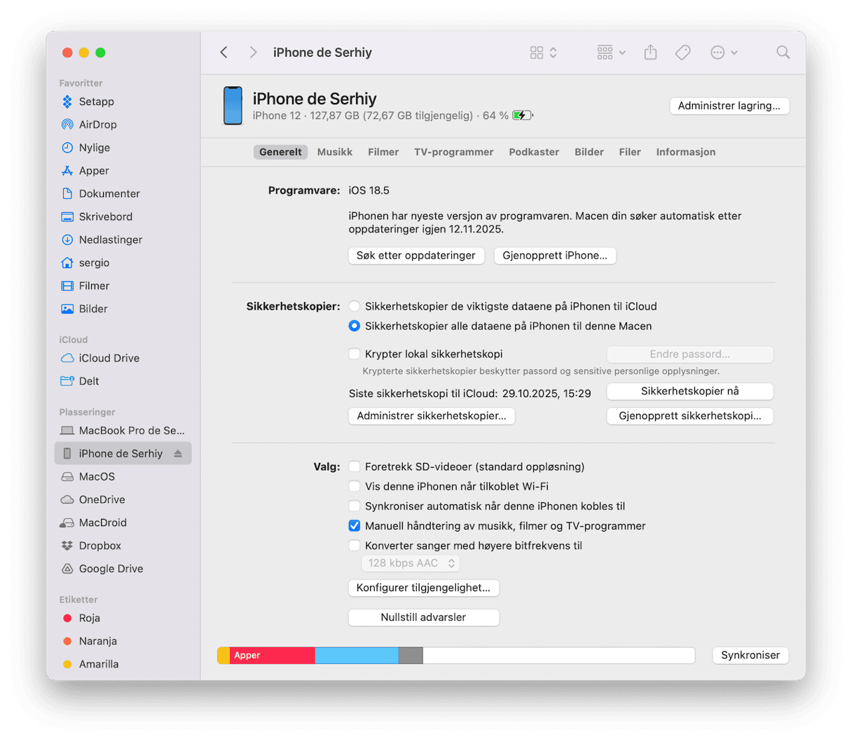 Det er greit å sjekke lagringsinformasjonen før vi begynner å slette ting. Slik ser for eksempel disklagringen min ut: