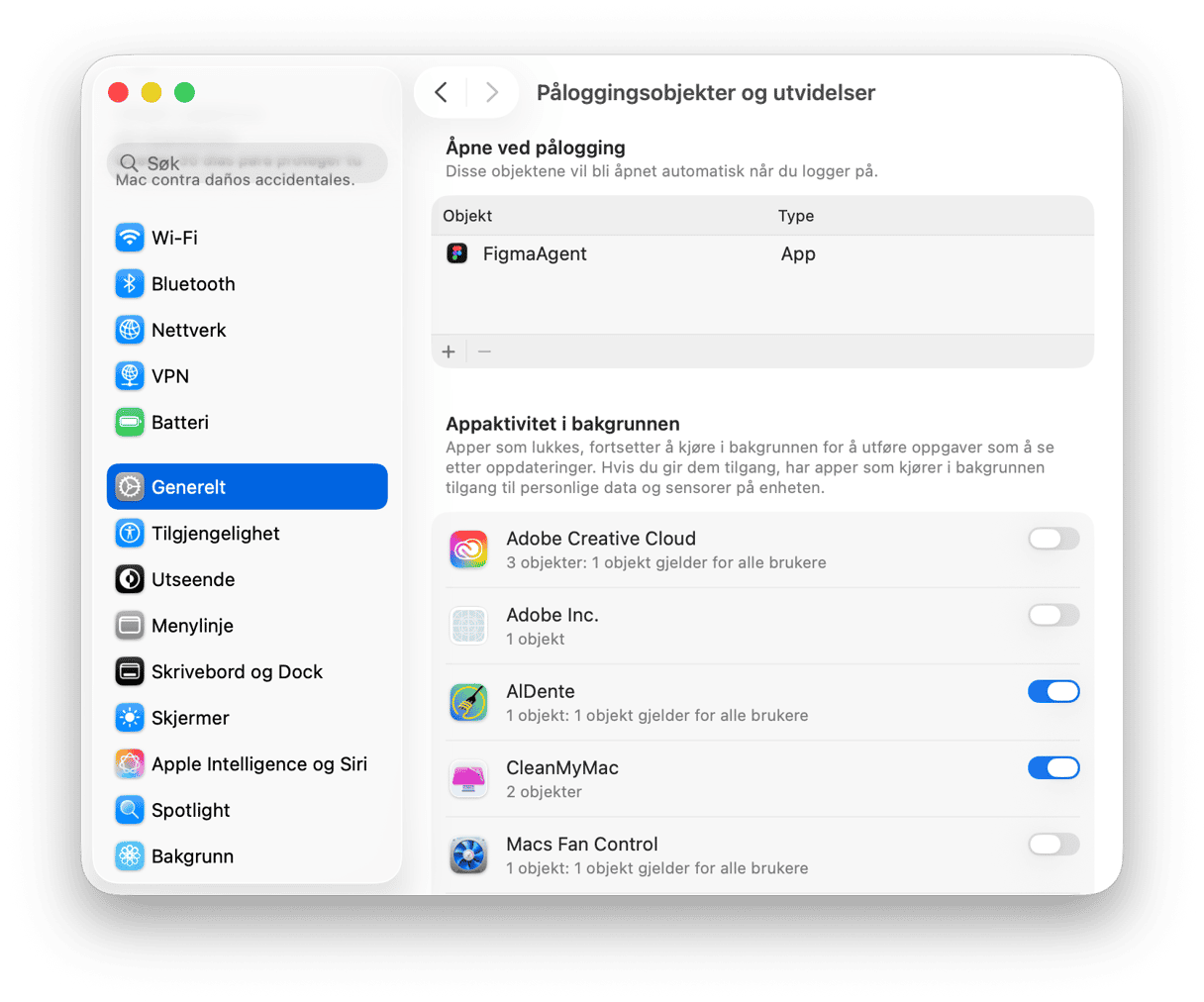 - Gå til Systeminnstillinger > Generelt > Påloggingselementer og gå gjennom appene og utvidelsene der.