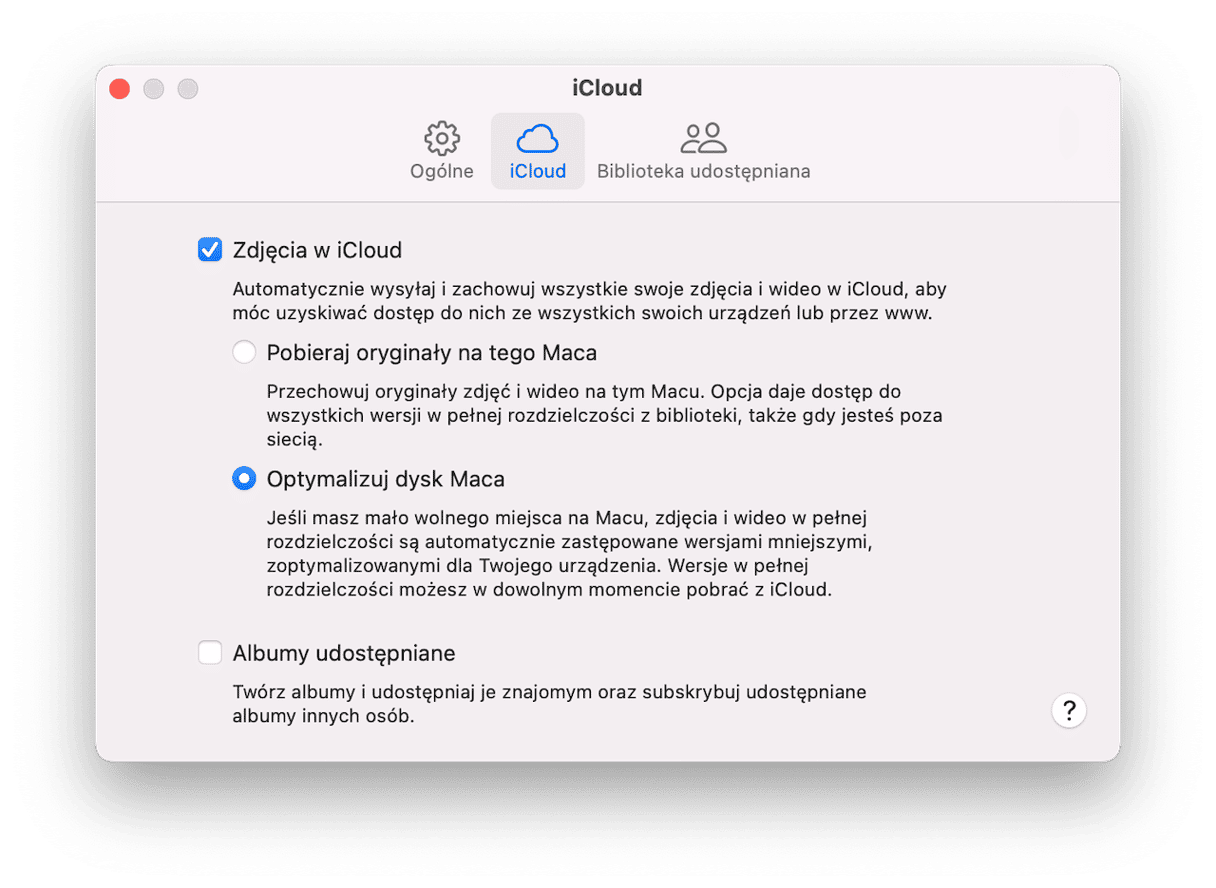 Jeśli korzystasz z aplikacji Zdjęcia do przechowywania i zarządzania zdjęciami, możesz zmniejszyć ilość zajmowanego przez nich miejsca, przechowując na Macu tylko kopie o niskiej rozdzielczości, z oryginałami w iCloud. Możesz pobierać oryginały zdjęć do edytowania albo udostępniania.