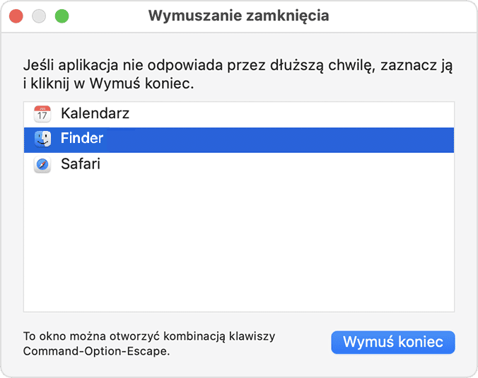 Jednym sposobem temu zapobiec jest zamknięcie nieodpowiadających aplikacji: naciśnij Option + Command + Esc, by otworzyć okno wymuszania zamknięcia. Wybierz apkę do zamknięcia i naciśnij Zakończ.