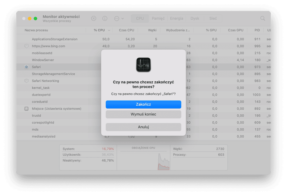- Zamknij zasobochłonne aplikacje (zużywające za dużo pamięci i CPU) przez Monitor aktywności. Wystarczy zaznaczyć pożerający zasoby proces, kliknąć X na pasku narzędzi > Zakończ.