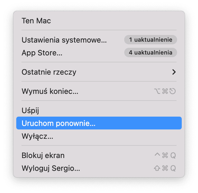 Ponowne uruchomienie Maca czyści pliki tymczasowe, a na nowszych Macach sprawdza dysk startowy. Jest to dobry i często skuteczny sposób, jeśli nie wiesz, w czym dokładnie polega problem.