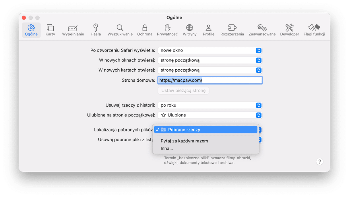 - Safari: Ustawienia > Ogólne (opcja Lokalizacja pobranych plików)