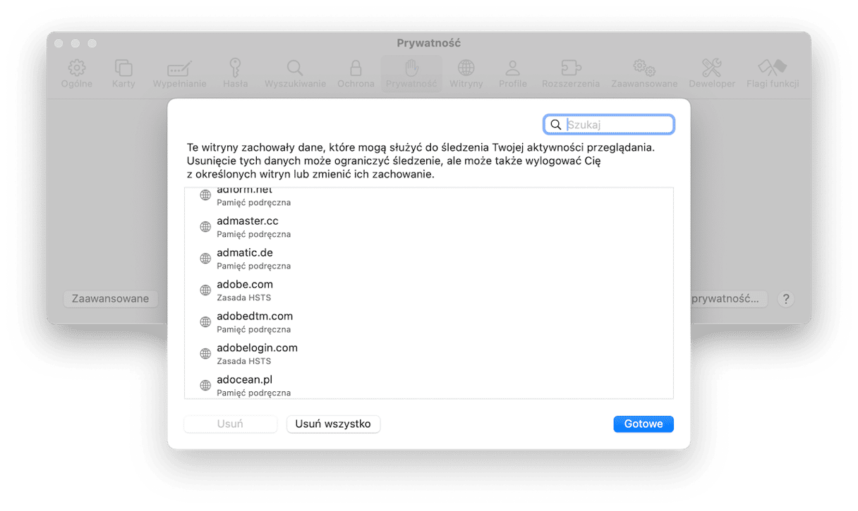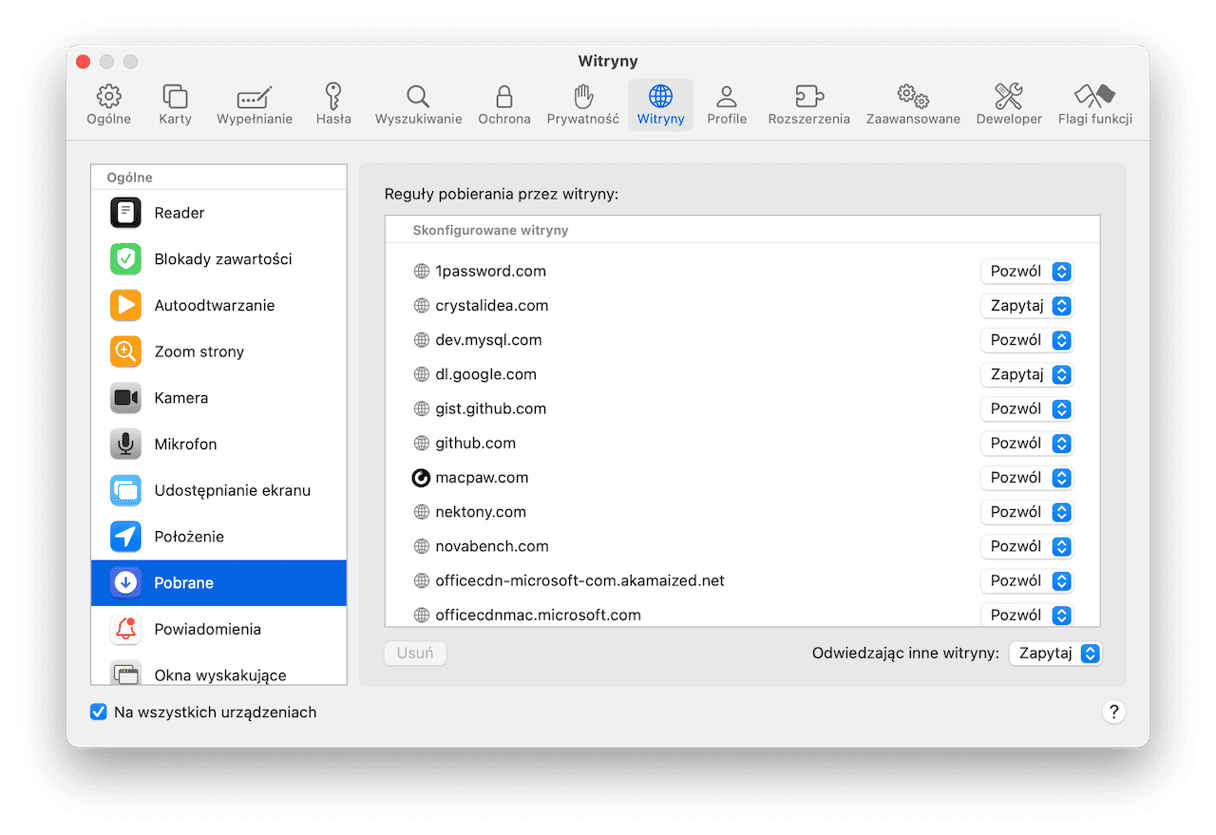 - Safari: otwórz Ustawienia > Witryny > Pobrane i sprawdź, które witryny mają to uprawnienie.