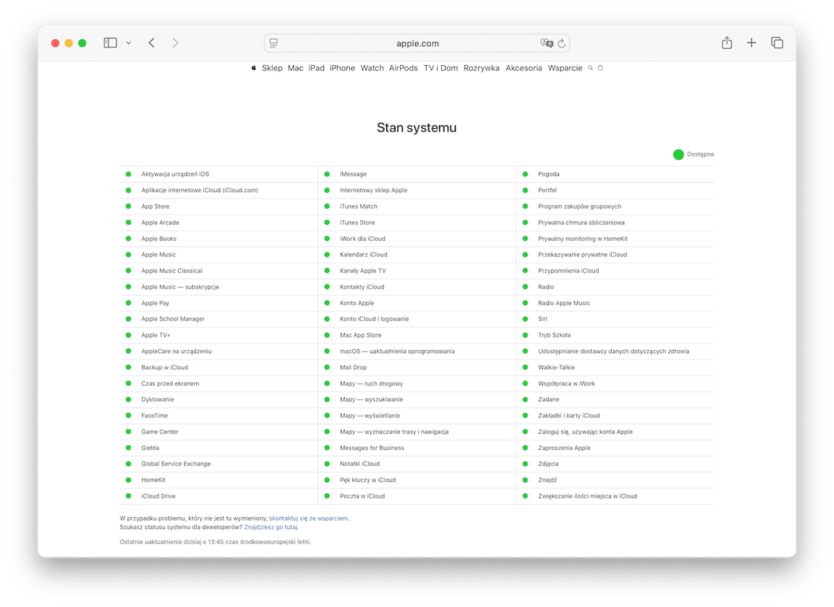 Jeśli pobierany plik pochodzi z App Store lub innego serwisu Apple, lub jeśli znajduje się w Twoim iCloud, być może problem jest na stronie serwerów Apple. Aby to sprawdzić, otwórz to łącze w przeglądarce. Szukaj usługi, skąd pobierasz plik, na przykład Mac App Store lub iCloud Drive. Jeśli obok znajduje się zielona kropka, to działa poprawnie. Jeśli nie, to jest problem. Możesz tylko czekać, aż zostanie naprawiony.