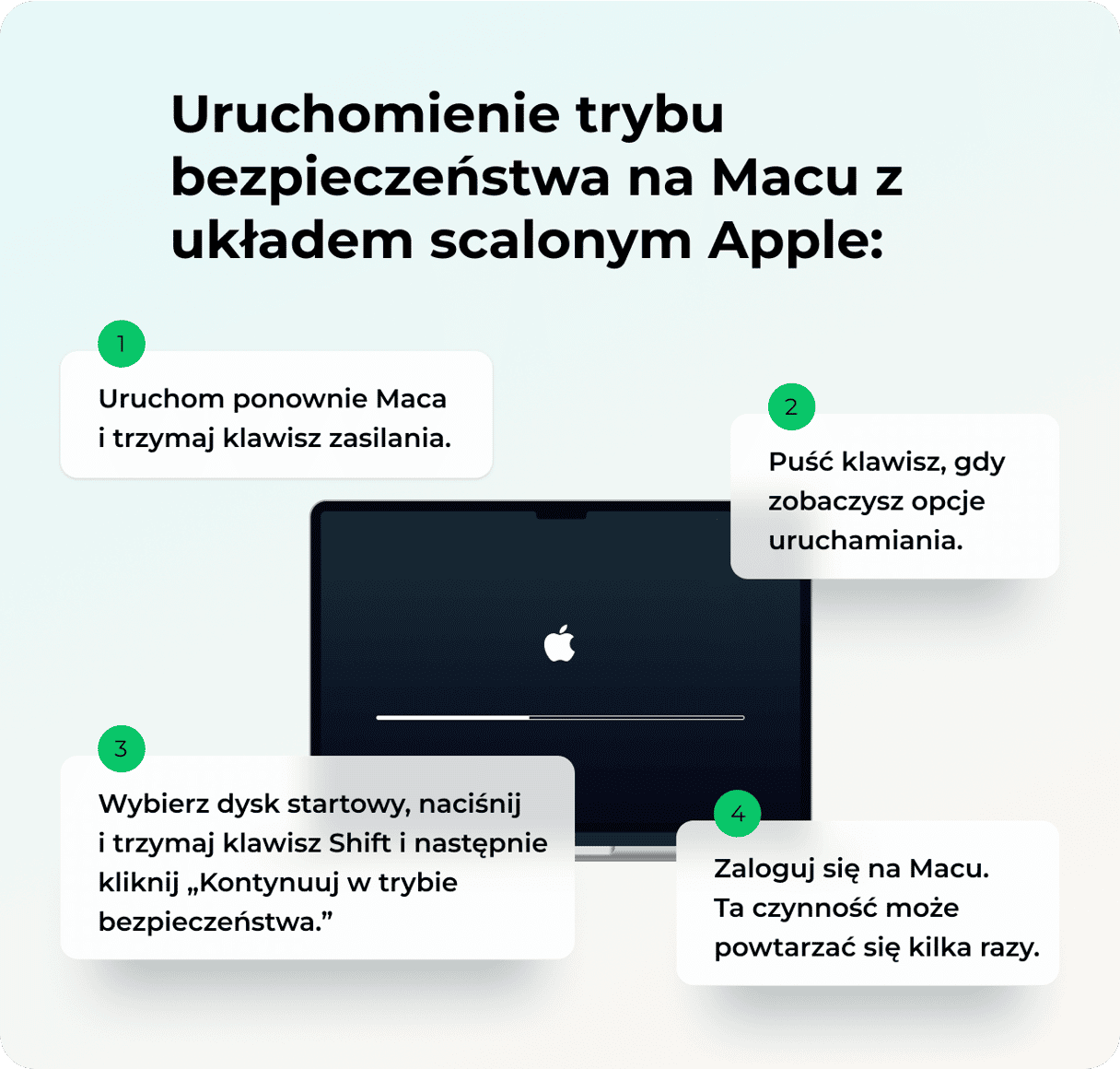 Tryb bezpieczeństwa uruchamia Mac bez niektórych rozszerzeń systemowych i rzeczy startowych. Również sprawdza dysk startowy, wykorzystując funkcję Pierwszej pomocy w Narzędziu dyskowym, czyści pamięć podręczną i inne pliki tymczasowe. Uruchomienie w trybie bezpieczeństwa, a następnie uruchomienie ponownie w trybie normalnym może naprawić wiele różnych problemów. Proces uruchamiania w trybie bezpieczeństwa zależy od układu i różni się dla Maców z układem Intel i Maców z Apple Silicon (na przykład, M1 MacBook Air, MacBook Pro albo Mac mini).