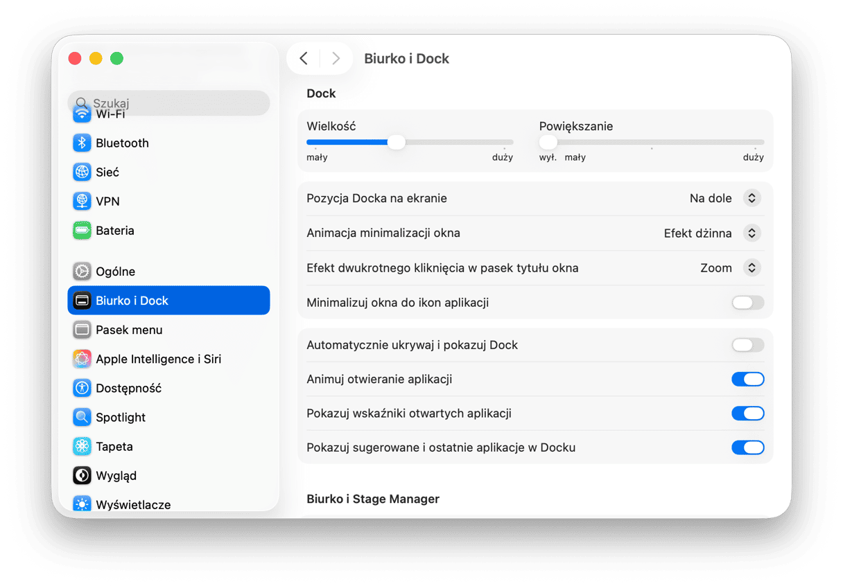 - W Ustawieniach systemowych wybierz Biurko i Dock.