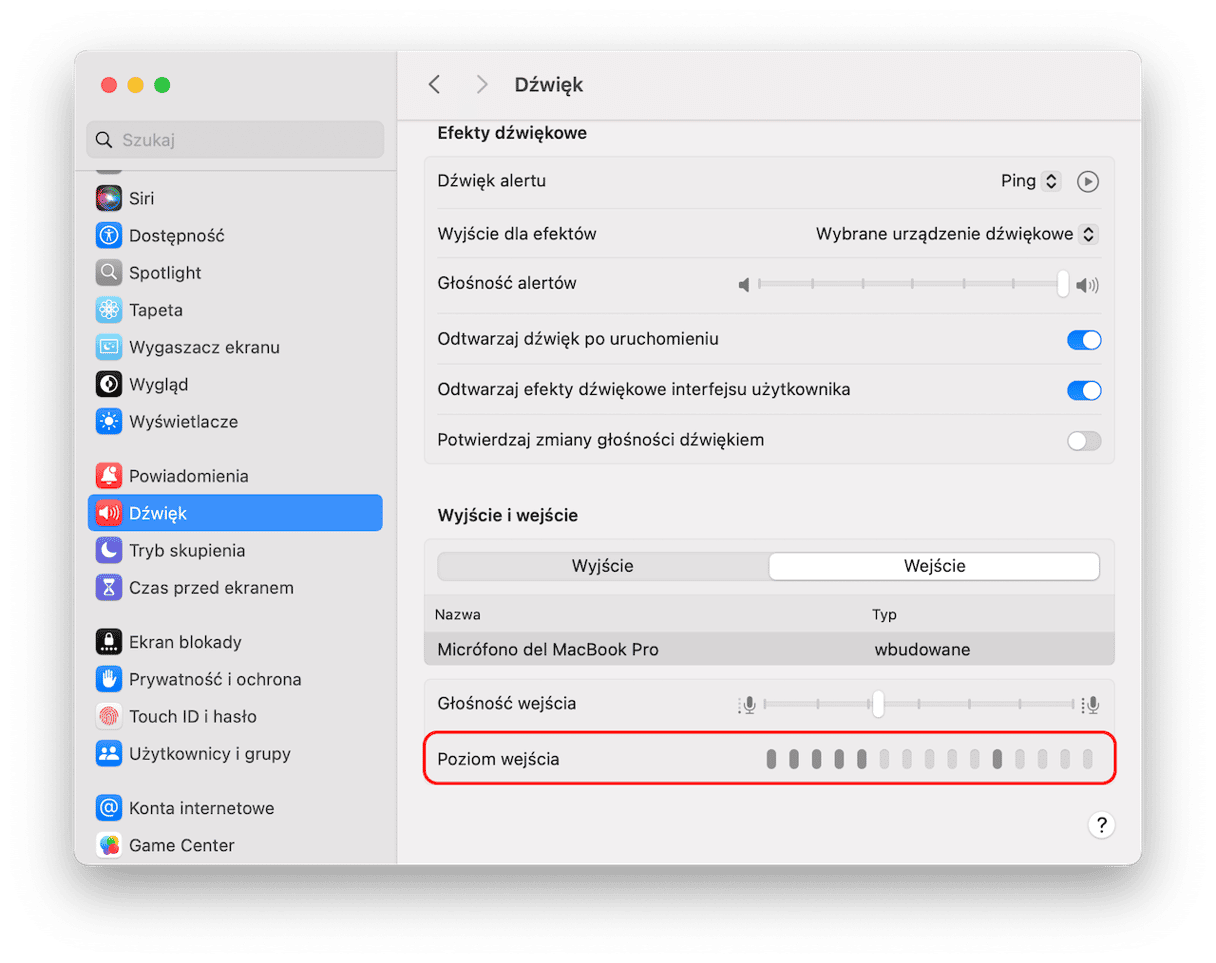 - Teraz podczas mówienia obok Maca powinny zapełniać się kreski poziomu wejścia.