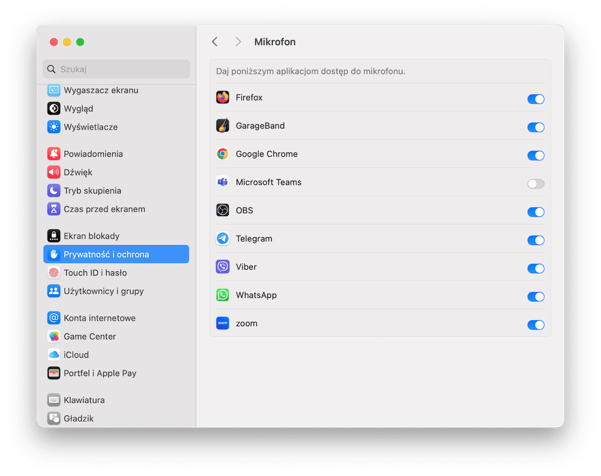 Jeśli z jakiegoś powodu przestał działać, to może się okazać, że zostało wycofane zezwolenie, więc trzeba go sprawdzić.Aby włączyć mikrofon na Macu, przejdź do Ustawień systemowych. Tutaj otwórz kartę Prywatność i ochrona. Wybierz Mikrofon z listy.