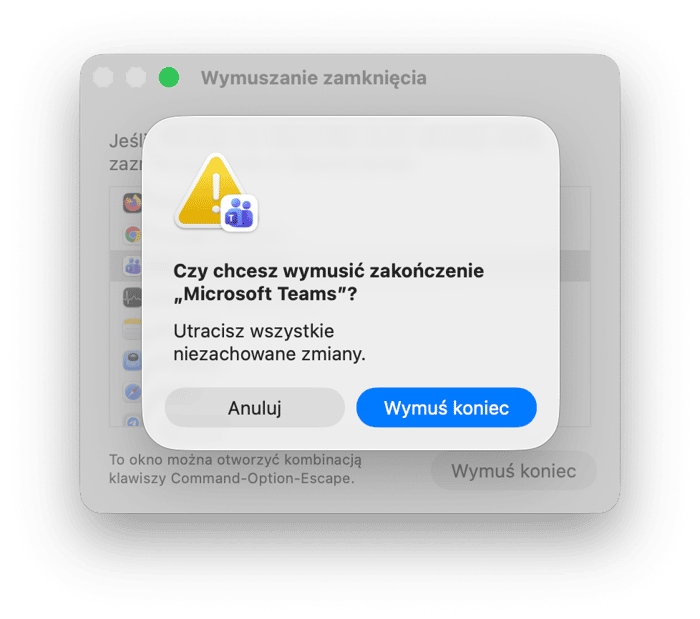 Jeśli Teams skacze w Docku, ale nie otwiera się, kliknij ją, trzymając klawisz Control, lub prawym klawiszem myszy i wybierz Wymuś zakończenie. Również możesz nacisnąć Command-Option-Escape, zaznaczyć Teams i kliknąć Wymuś koniec. Teraz spróbuj otworzyć apkę jeszcze raz.
