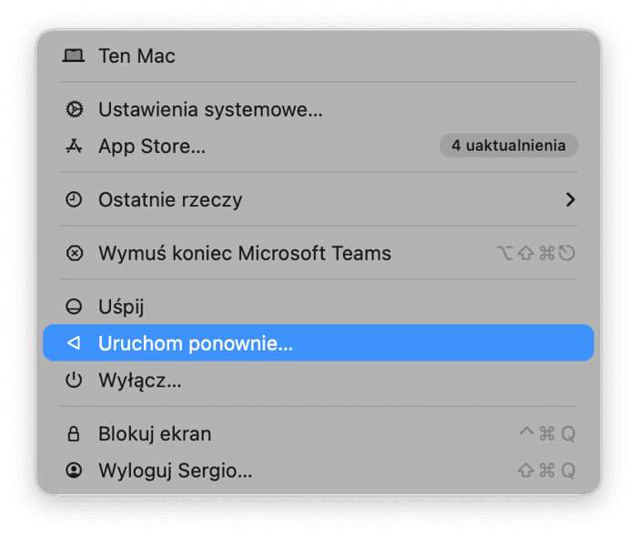 Jeśli Teams wciąż nie działa, spróbuj uruchomić Maca ponownie. To oczyści RAM i pliki tymczasowe, a to swoją drogą może naprawić problem. Otwórz głowne menu Apple i wybierz „Uruchom ponownie”.
