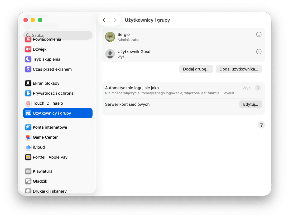 - Sprawdź zainstalowane profile w Ustawieniach systemowych > Użytkownicy i grupy. Kliknij ikonę i obok bieżąco zalogowanego użytkownika i upewnij się, że opcja Użytkownik może administrować tym komputerem jest włączona.Może być konieczne założenie nowego konta, jeśli bieżący użytkownik nie ma uprawnień administratora.