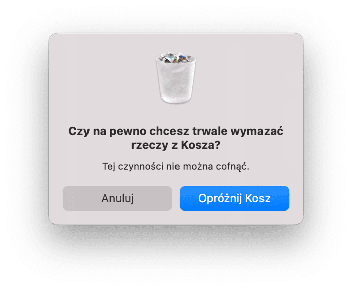 To może brzmieć jak coś niezwykle podstawowego, ale powinno oczyścić zaskakującą ilość miejsca. Zawsze o tym zapominamy. Rzecz w tym, że kiedy coś usuwasz – Mac nie wymazuję tej rzeczy, a przenosi ją do Kosza. No i pewnie już masz więcej usuniętych rzeczy, niż zdajesz sobie sprawę, i to wszystko może leżeć w Koszu, marnując miejsce. Więc opróżnij Kosz i wymaż te śmieci: