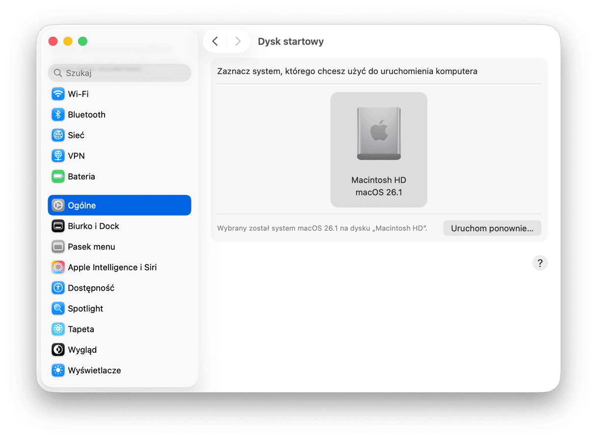 Dysk startowy (także rozruchowy) jest woluminem lub partycją dysku, zawierającym macOS i aplikacje i jest wykorzystywany do rozruchu Maca. Domyślnie jest to Macintosh HD (dysk wbudowany), ale możesz wybrać inny dysk w Ustawieniach systemowych.