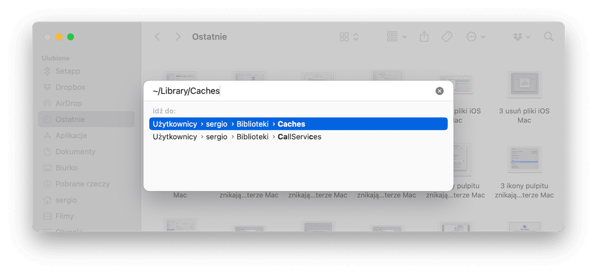 ~/Biblioteki/Cachesi naciśnij Return. Usuń największe pliki, ale zachowaj foldery. - Teraz znowu kliknij Idź > Idź do folderu.