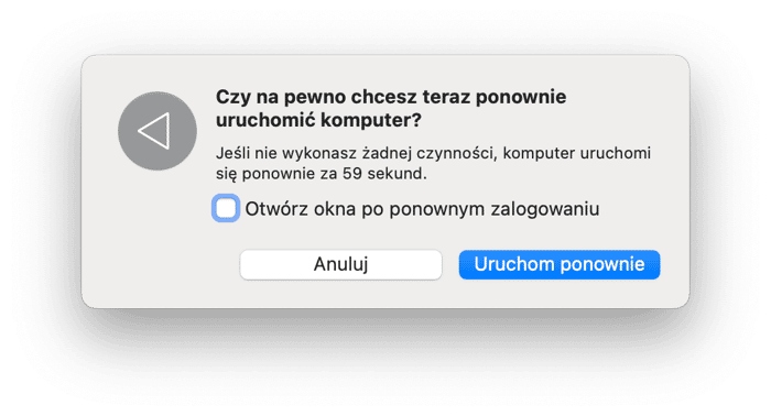 Po prostu kliknij Uruchom ponownie w głównym menu Apple. Upewnij się, że opcja Otwórz okna po ponownym zalogowaniu jest wyłączona.