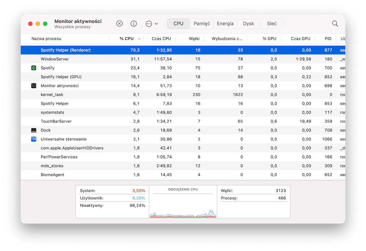 Tabela na dole wyświetla procent obciążenia systemu. Jeśli jest powyżej 50% i tak pozostaje przez dłuższy czas bez dobrego na to powodu, na przykład bez gier albo programów renderujących, to może sugerować, że procesor jest „wąskim gardłem” systemu.