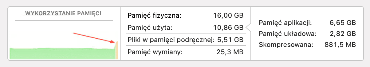 Innym możliwym problemem jest brak pamięci o dostępie swobodnym (RAM). By sprawdzić, czy potrzebujesz więcej RAM, znowu otwórz Monitor aktywności. Jest w folderze Aplikacje/Narzędzia. W karcie Pamięć zobaczysz tabelę i wykres wykorzystania pamięci. Jeśli wykres jest czerwony, a pamięć jest ciągle obciążona uruchomionymi aplikacjami, to znaczy, że znaleźliśmy problem.