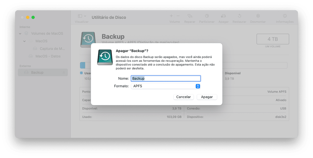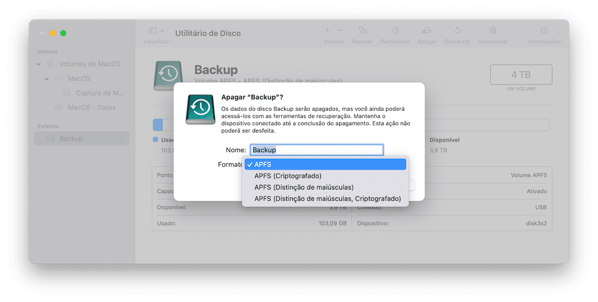 Caso o Time Machine não reconheça o disco externo, talvez seja necessário usar o formato APFS. Mostraremos como fazer isso a seguir.