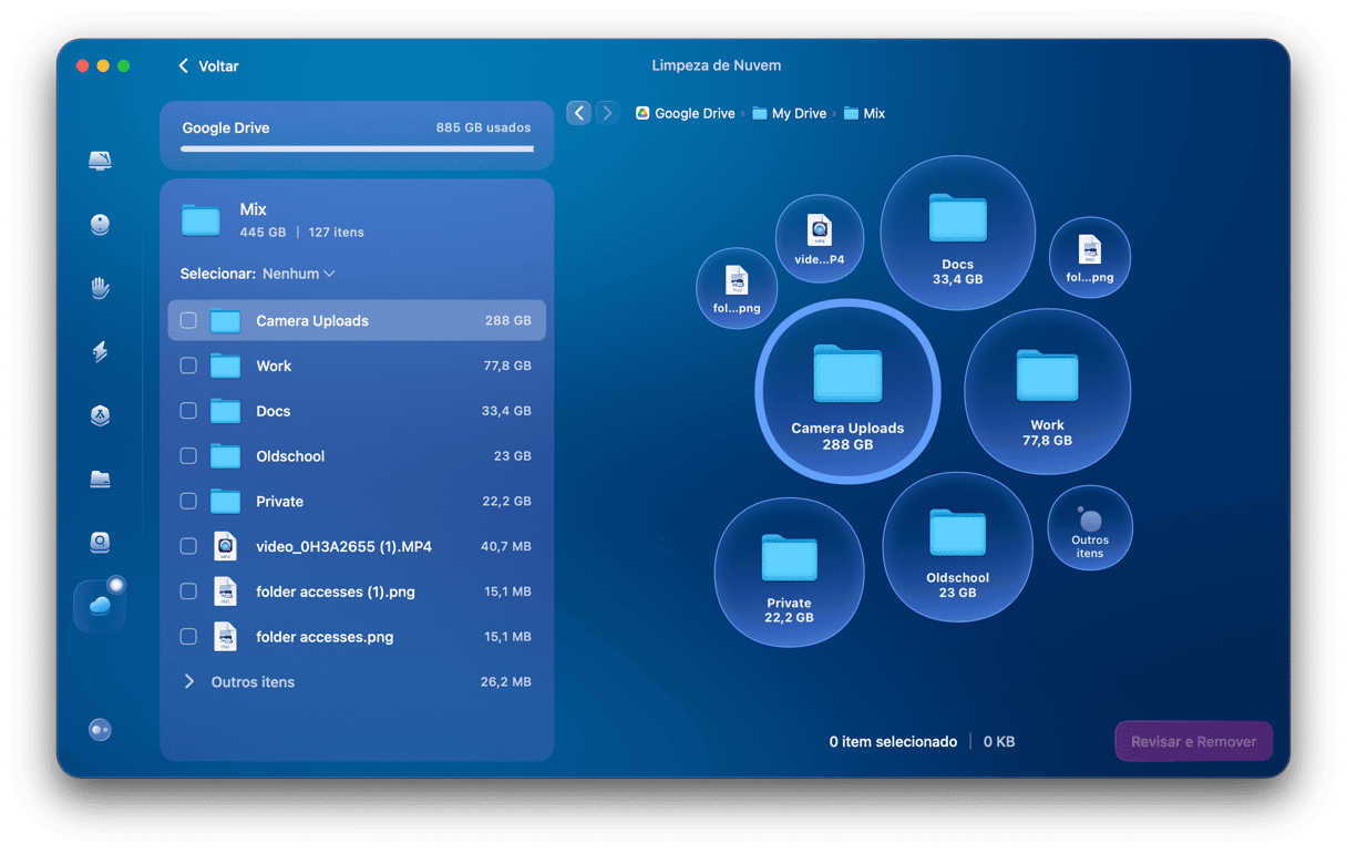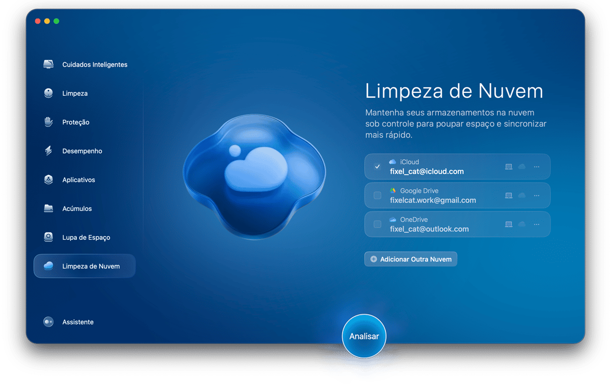 Para ir além, experimente a ferramenta Limpeza de Nuvem do CleanMyMac. Ela se conecta às suas contas para que você tenha uma visão dos arquivos que estão armazenados na nuvem. Você verá rapidamente quais arquivos estão sincronizados localmente e quais estão apenas na nuvem, o que ajuda a tomar decisões melhores sobre o armazenamento. Veja como fazer isso passo a passo: