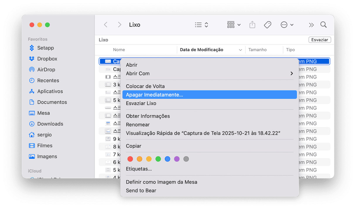 Você sabia que dá para apagar arquivos específicos em vez de remover tudo o que está no Lixo? Basta selecionar um arquivo, clicar com o botão direito sobre ele e escolher Apagar Imediatamente.