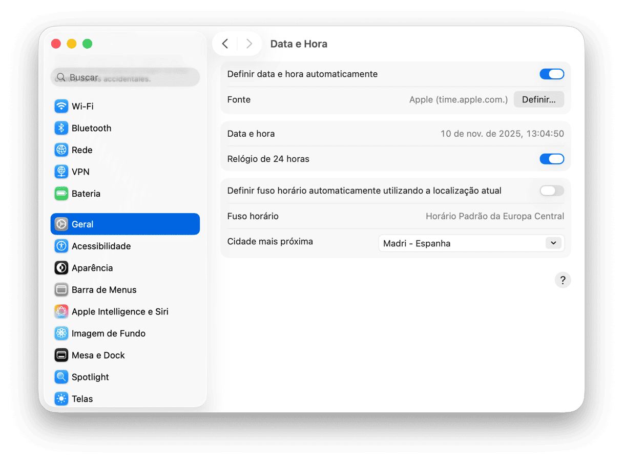 A hora no Mac deve estar sincronizada com o servidor ao qual o dispositivo está conectado. Por isso, ao se deparar com o erro de certificado inválido, verifique os ajustes de data e hora.