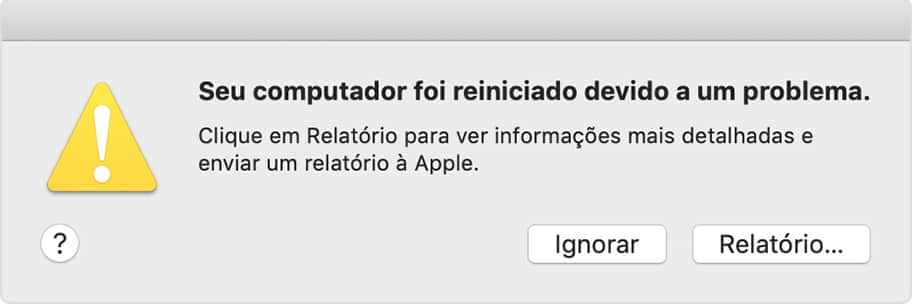 Depois de reiniciar, o Mac mostra uma notificação sobre o porquê da falha ter ocorrido. Você pode clicar no botão Relatório para ver os detalhes.